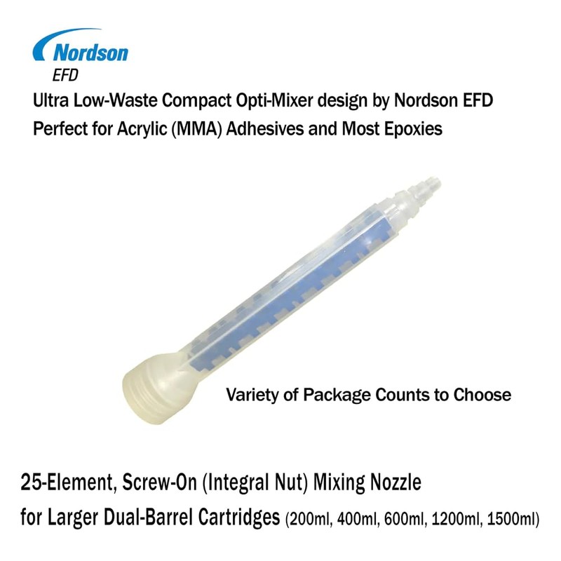 Nordson EFD medium length 5.6-Inch (25-Element) universal mixing nozzles / tips for all standard C-System (screw-on) 200ml, 400ml, 600ml and 1500ml 2-Part epoxy and adhesive cartridges in all ratios (1:1, 2:1, 4:1 and 10:1) This new OptiMixer design allows for thorough mixing in the shortest-length nozzles on the market, which leaves the least amount of wasted material across all other mixer styles, and allows users to get closer to the materials they are bonding. It has a screw-on inlet, meaning it screws directly onto the cartridge and requires no additional locking nut to secure it. And the outlet has a stepped-tip that can be cut to adjust the amount of adhesive being dispensed.