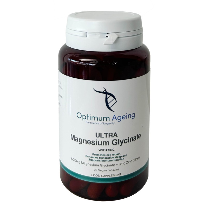 Optimum Ageing Magnesium Glycinate 500mg with Zinc Citrate 8mg – High Absorption Chelated Formula – Muscle, Sleep, Heart & Immune Support – Non-GMO, Gluten-Free – 90 Vegan Capsules