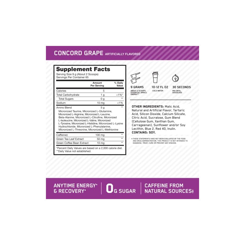 Optimum Nutrition Amino Energy - Polvo energtico para antes del entrenamiento con t verde, BCAA, aminocidos, extracto de caf verde, sabor uva Concord