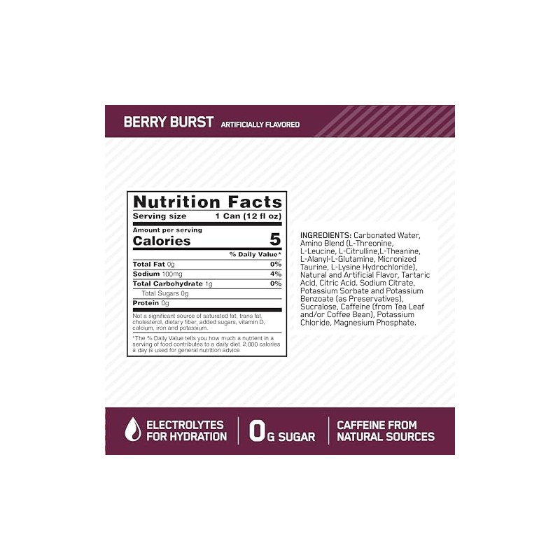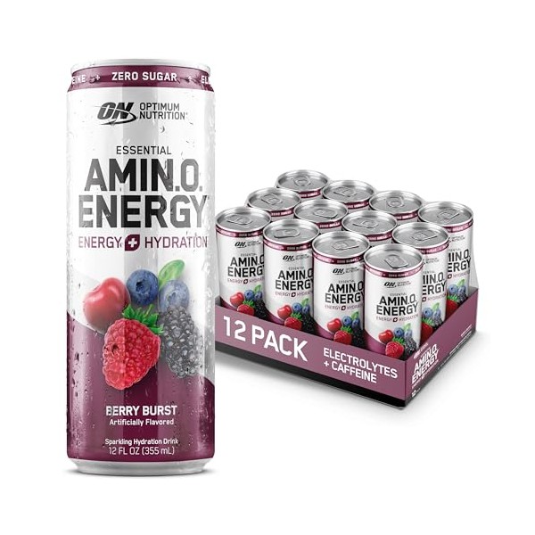 Optimum Nutrition Optimum Nutrition Amino Energy Sparkling Hydration Drink, Electrolytes, Caffeine, Amino Acids, BCAAs, Sugar Free, Berry Burst, 12 Fl Oz, 12 Pack