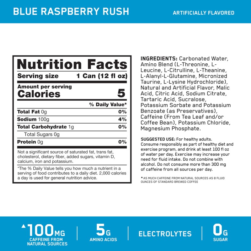 AMIN.O. ENERGY Blue Raspberry Rush Drink is more than an energy drink! It's an icy blast from the past for anytime energy from 100mg of caffeine from natural sources plus electrolytes, 5g of amino acids, and a frosty rush of electrifying blue raspberry taste with zero grams sugar! Unlock energy + hydration and get what you want to energize, thrive, and unlock more you whenever or whenever you need it C from your morning boost to your afternoon pick-me-up. Every sip's a throwback back to summer days with a bubbly blast of sweet and tart blue slush flavor C all from Optimum Nutrition, the Worlds # Sports Nutrition Brand
