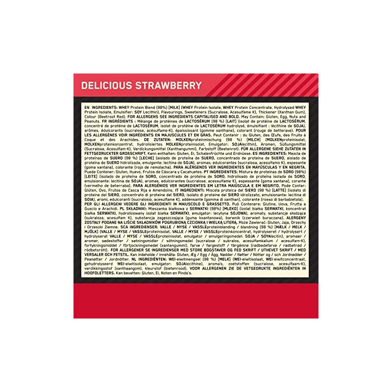 Optimum Nutrition Gold Standard 100% WHEY is the worlds best-selling protein powder*. Quick and easy to prepare, our high-quality whey protein is ideal for boosting your protein intake at breakfast, and kick-start muscle protein synthesis before your workout and as part of your recovery routine**. ON whey protein powder is Informed Choice certified and is proven to help you stay on track with your fitness goals. Our award-winning formula contains naturally occurring BCAAs and glutamine, plus 24 grams of high-quality, fast-absorbing whey protein powder with whey protein isolate as the main ingredient that helps with muscle gain and supports recovery* after every training session. Designed for the goal-focused athlete, fitness lovers and those who are looking to get into shape, our ON pre-workout protein powder comes in a variety of great-tasting flavours: double rich chocolate, banana cream, vanilla ice cream, white chocolate raspberry, delicious strawberry and many more. Low quantities of sugar and fat keep things on the healthy side. Gold Standard Wheys ready-to-mix formula means you can enjoy it any time of day, whether as protein shakes or as an addition to your favourite meals and drinks C our unflavoured protein powder is perfect to create your own tasty recipies. Gold standard whey protein is available in a range of different serving sizes and easy to prepare: simply mix one rounded scoop in 180-240 ml of cold water. ON protein powder is best enjoyed first thing in the morning or/and during the 30 minutes just before or immediately after training. *Source: Euromonitor International Limited; Consumer Health 2023 edition, Sports Protein Powder category, % retail value shares, 2022 data ** Protein supports growth and maintenance of muscle mass: Source EFSA Journal 2010;8(10):1811; 2011;9(6):2203