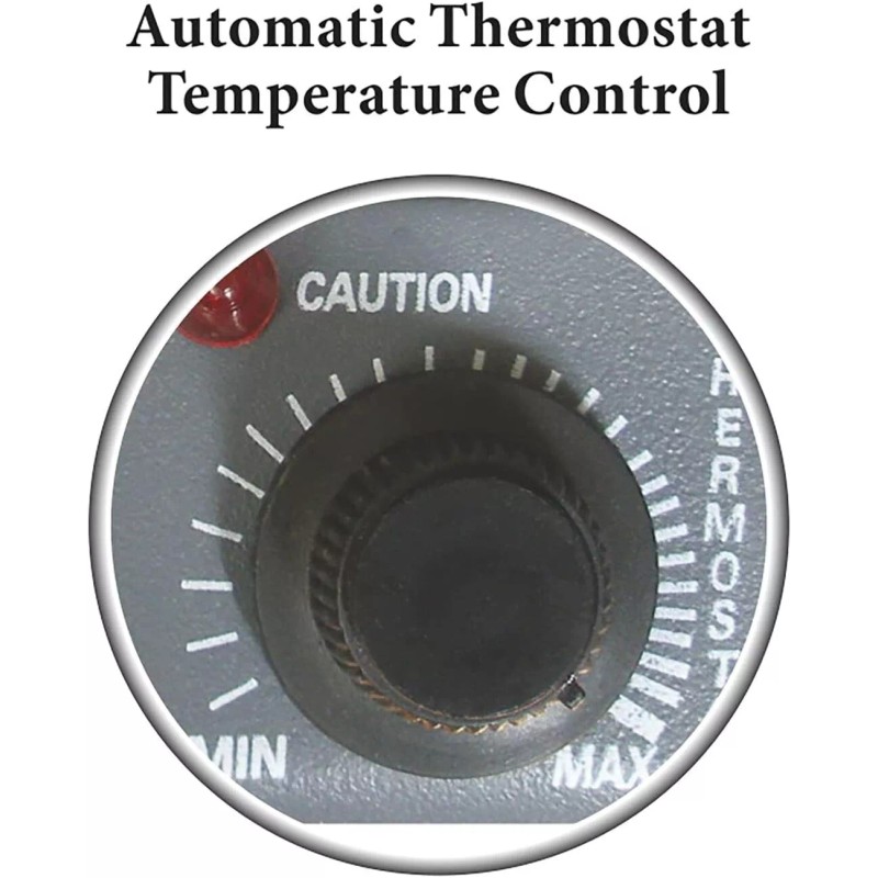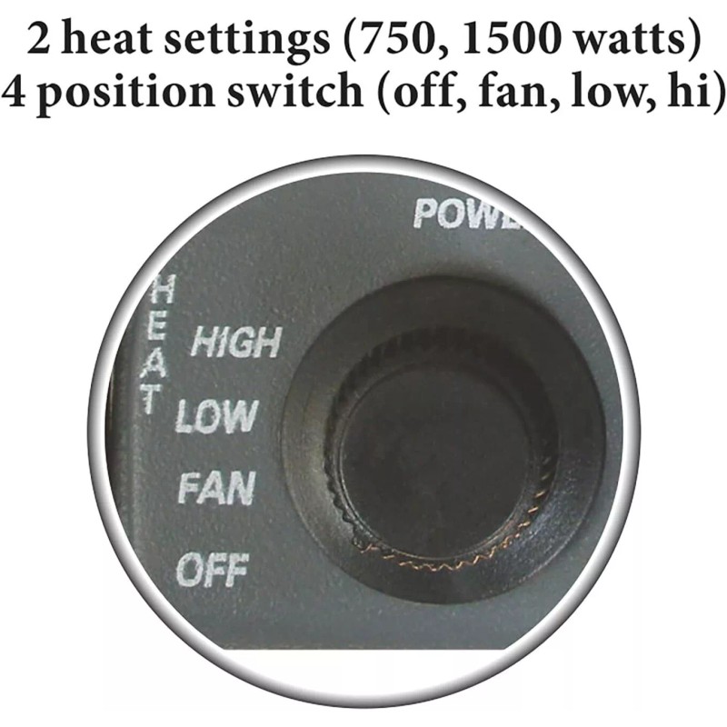 - 2 Heat settings (750 and 1500 watts/5118 BTU), Fan Only Setting * 4 Position Function Switch (Off, Fan, Low and Hi) * Automatic Thermostat Control * Internal Heat Limiting Thermostat * Thermal Cut-off Safety Device * Overheat Protection Circuit with Warning (Alert) Light * Power Indicator Light * Durable and Heavy Gauge Sheet Metal Cabinet