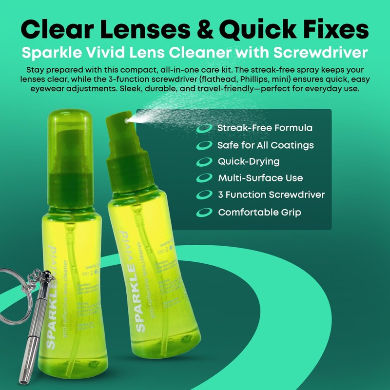 - Glasses Cleaner Kit: This eyeglass cleaning kit includes two bright green 2oz spray bottles, two bright green microfiber cloths and a compact screwdriver for quick repairs. Ideal for daily use as a lens cleaner cloth, lens cleaner for eyeglasses, and screen cleaner.