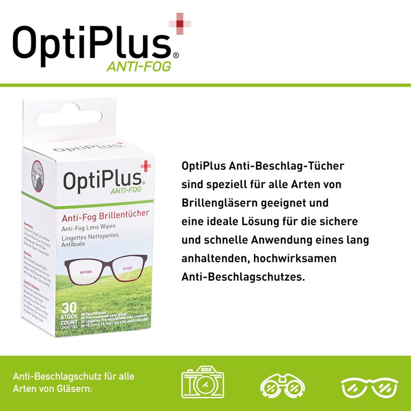 - OptiPlus anti-fog cloths protect against annoying fogging, especially when changing from cold to a heated room, enjoying hot drinks, cooking or sports to working with safety glasses