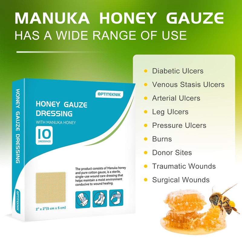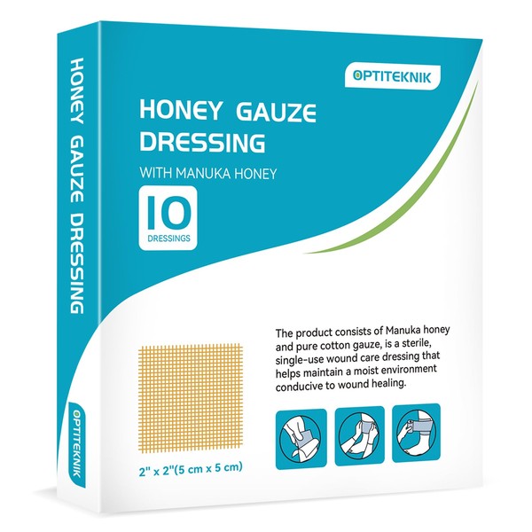 OPTITEKNIK Manuka Honey Gauze Dressing 2"x2" Pack of 10, Manuka Honey Wound Care Bandage for Cuts, Scalds and Burns, Wound Dressing Products