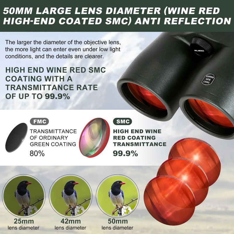 - [Professional HD Binoculars]Bird watching binoculars for adults is made of BAK4 prisms and FMC telescope Fully Multi-Coated Lenses with 50MM large objective lenses,which enables you to see clear and colorful targets through the telescopio in time in a dim environment.
