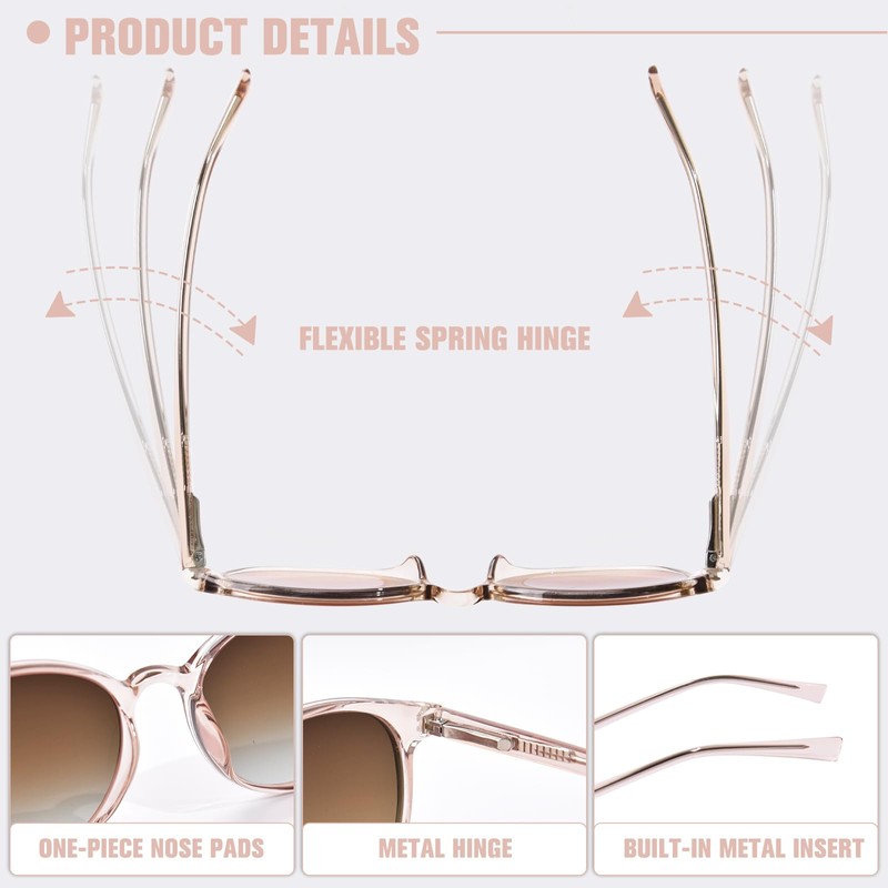 - EASY MATCHING - The brief round frame without any complicated ornaments shows delicacy and elegance. TR90 frame arms with spring hinges fit medium and large faces in comfort and style. These sunglasses with readers will be your everyday glasses in all seasons. Wonderfully versatile - can be matched with your daily wearing.
