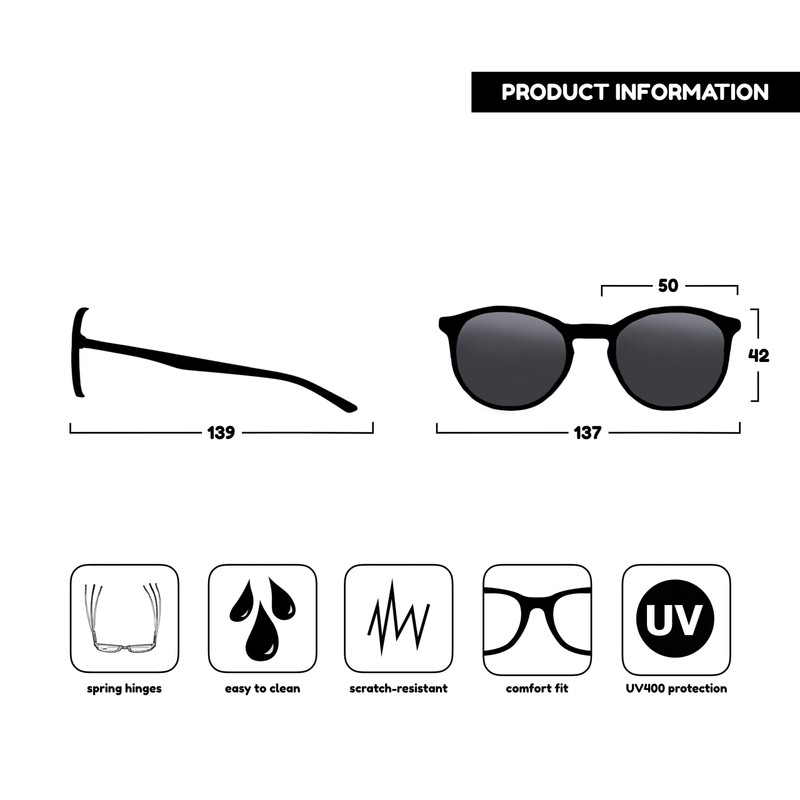 - UV400 protection. Blocks UVA and UVB rays. Durable round frame design with spring hinges.