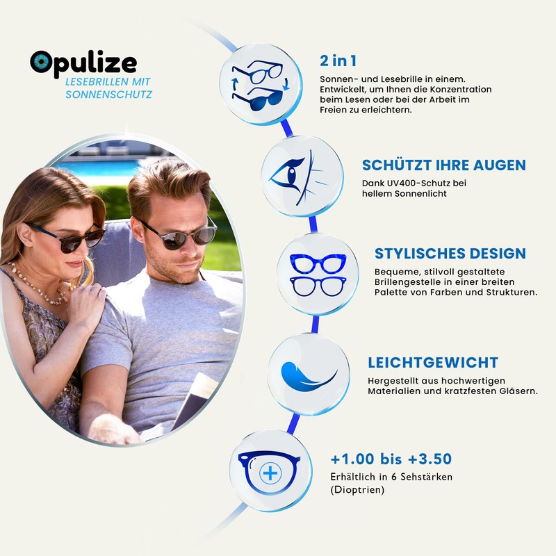 - SUMMER SUN: Want to read in the sun? With the affordable sunglasses from OPULIZE you can now protect your eyes and see clearly at the same time. Ideal for mobile phone, laptop, tablet and kindle. UV400 Glass Blocks UVA and UVB rays