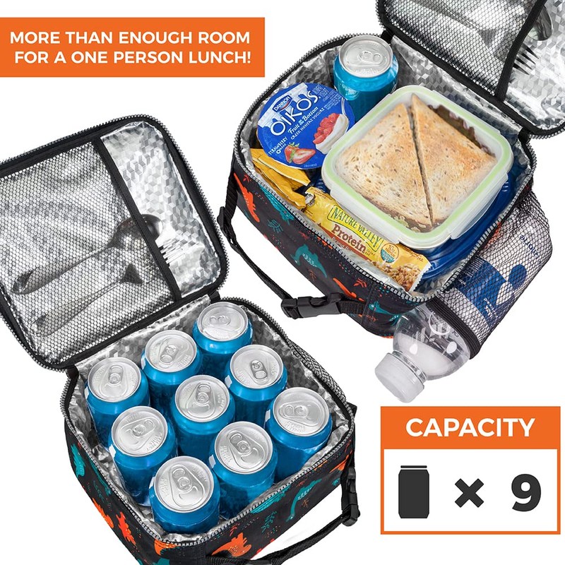- DURABLE AND SPACIOUS LUNCH BOX: Our insulated lunch bag kids measures 10 x 8 x 4.5 inch (L x W x H) and can easily fit 6-9 cans or one person's lunch. The inside lining can be easily wiped clean with a damp cloth. With its waterproof and durable construction, our soft kids lunch boxes tested for safety and passed CPSIA Lead, CSPA Phthalates & Cadmium Test - Manufacturer recommended age: Ages 3+.