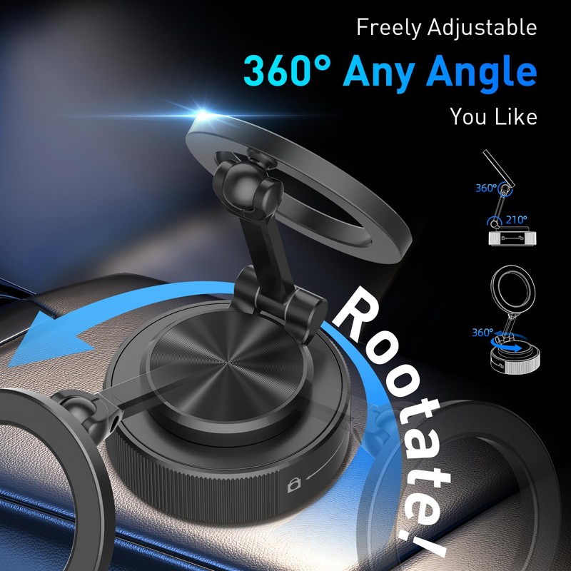 • 360° BASE ROTATION & 360° BALL-JOINT ADJUSTMENT: This car phone mount features a 360° rotating base and 360° ball-joint structure, allowing you to easily adjust the angle to suit your needs. Whether in your car or office, you can seamlessly switch between portrait and landscape modes. Its unique foldable design reduces the mount's size by 50% when not in use, keeping your space tidy. Rigorously tested over 5,000 durability cycles, it remains stable and reliable for long-term use.