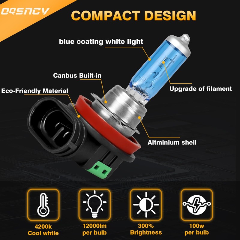 - đă300% Brighter/Power SavingăThe headlight bulbs are 3 times brighter than original bulbs, 100W per bulb, 4200K white perfect beam. Halogen light bulbs with new chips, luminous flux up to 12000 lumens/bulb.This Halogen headlight beam has perfect beam patterns and excellent cut-off lines. No black spots. No Flashing or Flickering. Also it gets a 100% power saving compared with original halogen.