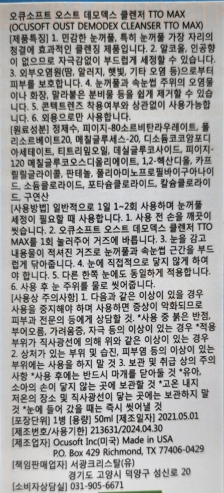 OQsoft Ostdemodex TTOMAX eyelid cleanser - 50ml (expiration date: 2025.11.30) / 오큐소프트 오스트데모덱스 TTOMAX 눈꺼풀세정제 - 50ml(사용기한:2025.11.30)