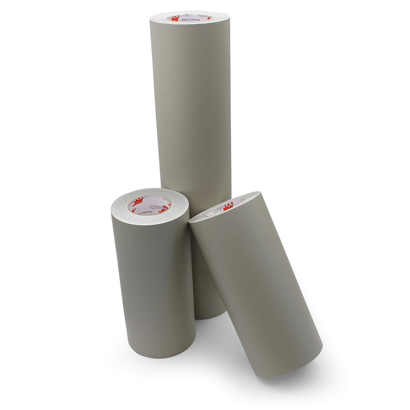 Translucent grey coloured special PVC film with matte surface. Specially designed for use as a stencil film for all painting and spraying work in vehicle labelling, stencil painting, advertising and exhibition construction. Due to the high suppleness, this stencil film is suitable for painting and spraying work on flat and especially on uneven surfaces. The translucent colouring ensures the visibility of the surface. Not suitable for wet bonding.