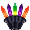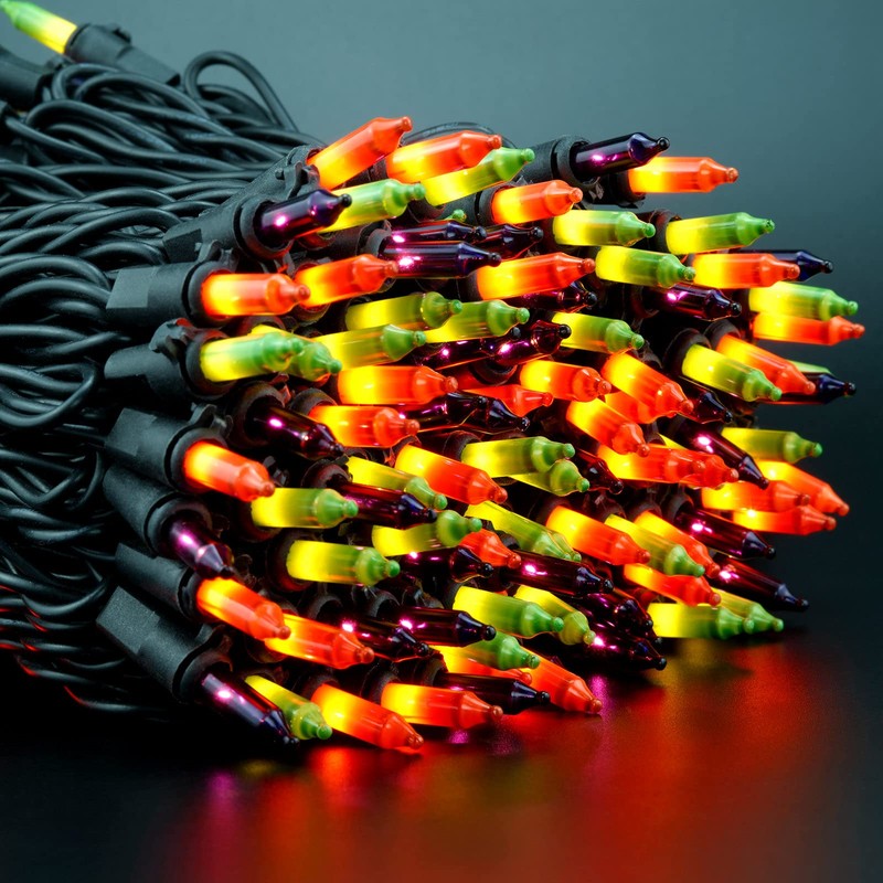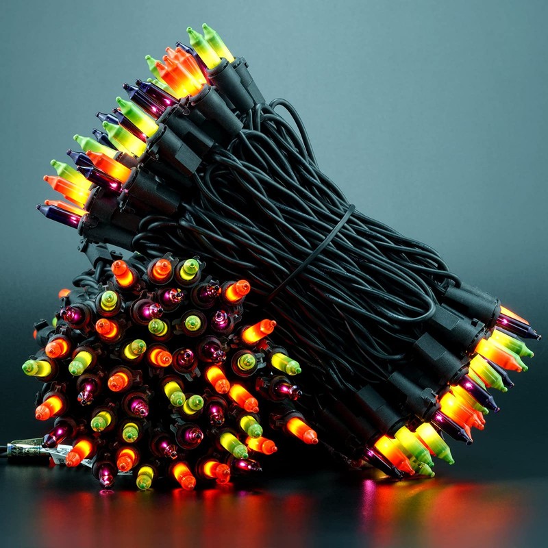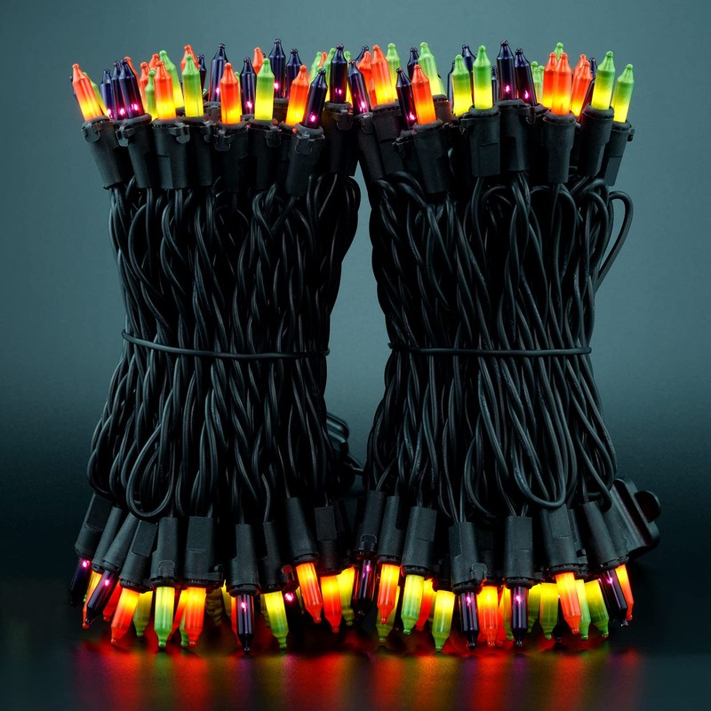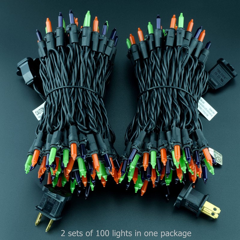 - 2 STRANDS IN 1 PACK ♥ 200 orange, green and purple mini bulbs spaced on black cord, total length 66 ft. 2 strands of 100 lights in one package. 33 feet per strand, 4 inch spacing, 4 inch lead, 4 inch tail. A string of lights, a collection of soft orange, green and purple mini lights, add a pop of stunning color to your indoor and outdoor surroundings!