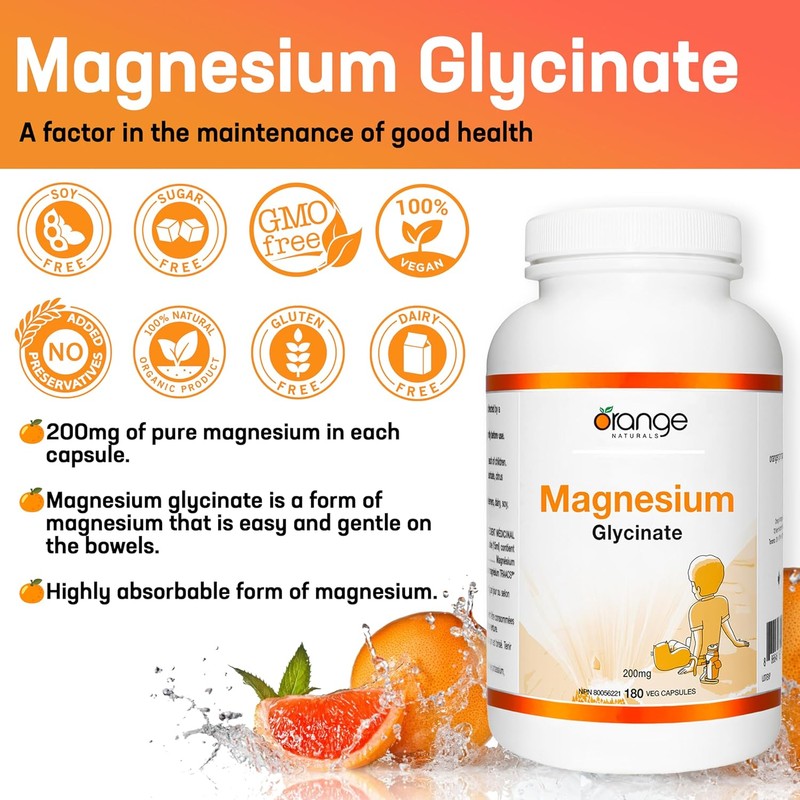 Orange Naturals - Magnesium Glycinate Supplement 200mg 180 v-caps 6 Month Supply - For Healthy Bones, Teeth, Proper Muscle Function, Promote Sleep Relaxation - Vegan - Highly Absorbable Form - Non GMO