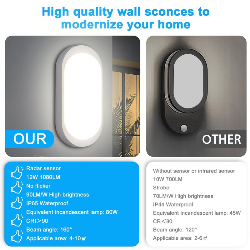 - berempfindliche 5,8-GHz-Radar sensorDiese Wandlampe mit Bewegungsmelder verwendet fortschrittliche Mikrowellenradar- und optische Sensorsysteme, die keine Verz?gerung hat, nicht von der Umgebungstemperatur beeinflusst wird und der Infrarotabtastung berlegen ist. Sie schaltet sich automatisch fr 60s ein, wenn sie innerhalb von 5 Metern jemanden im Dunkeln erkennt, und erlischt automatisch, wenn die Person den Bereich verl?sst. Hohe Energieeffizienz. Erfassungsbereich: 360 Grad.