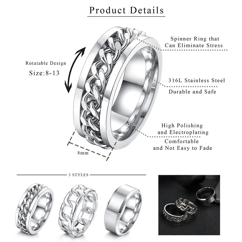- VALUABLE BAND RINGS SET:One Order You Will Get 3 Pcs Stainless Steel Rings in Different Style,1 Pcs High Polished Pure Silver Ring,1 Pcs Spinner Chain Ring,and 1 Pcs Sturdy Cuban Chain Ring,All in Silver Tone.Muti-style Give You Mutiply Wearing Chioce Everyday, Suitable for men