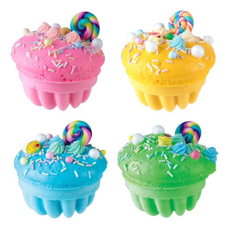 - Each ORB Curiosities Cloud Puff Treats 4 Pack Includes Four Individual Foam Cupcake Jumbo Play Food Squishies - 1 Green Cupcake, 1 Pink Cupcake, 1 Yellow Cupcake, and 1 Blue Cupcake.