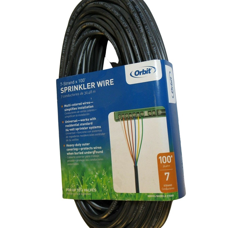 The Orbit 7-Conductor by 100-Foot UF/UL Wire #57088 is high grade 7-strand sprinkler valve control wire constructed with PVC jacket for convenient direct burial. Each wire will adequately handle one solenoid valve up to a maximum of 800 Ft.