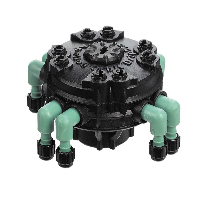 - VERSATILE: Eight, 1/4 inch barbed ports with threaded caps to close ports not in use. Elbows rotate 360 degrees for easier line placement