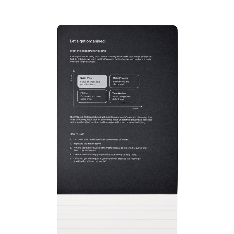 - EFFECTIVE PRIORITIZATION TOOLS: Learn how to prioritize which tasks to tackle first. In the back pocket is a guide to using the impact/effort matrix (which we use at Orbitkey!) The external insert also doubles as a bookmark and ruler