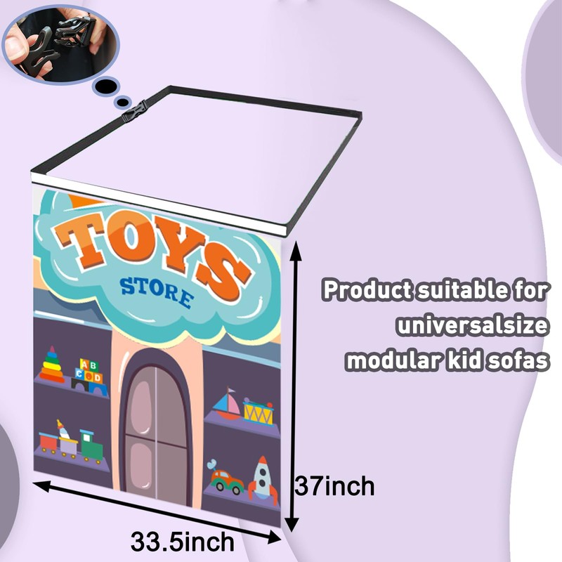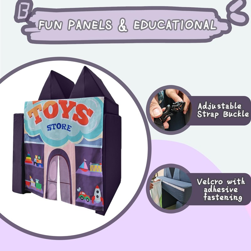 Toy house play panel: children can hang the toy house panel in various small spaces, rich color design makes the whole space become very attractive, children can not only use him as a toy store to experience the joy of being a store manager, but also can be used to store their toys, exercise the habit of small children to organize their toys independently. MULTIPLE PANELS FOR YOUR CHOICE: We offer ice cream store, soccer field, hospital, toys, chess multiple panels to play with, let your kids let their imagination run wild, even if they stay at home, they can create multiple different spaces to add fun. DURABLE AND BREATHABLE MATERIAL: Our sofa play panel is made of high quality polyester blend material, built-in Velcro as well as stickable surface, and adjustable straps, can be secured with either straps or sticky surface directly, easy to operate. Our panel is 33.5 inches long and 37 inches wide, it fits most modular sofas, even if you don't have a modular sofa you can stick him in any other accessible space, you can build a unique ice cream store in a very short time, and it is easy to carry. Our box includes: 1* Toy House Play Panel with straps, 1* Adhesive Velcro Strip, couch is not included!