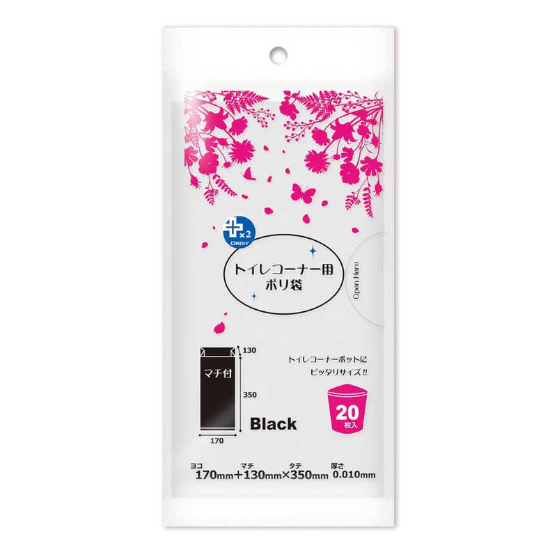 Ordiy PP-TC-20 Sanitary Plastic Bags, Garbage Bags, Black, 20 Pieces, Width 6.7 x Height 13.8 x Depth 5.1 inches (17 x 35 + 13 cm), Thickness 0.00004 inches (0.01 mm), Toilet Corner, Hard to See Contents, Gusset Included