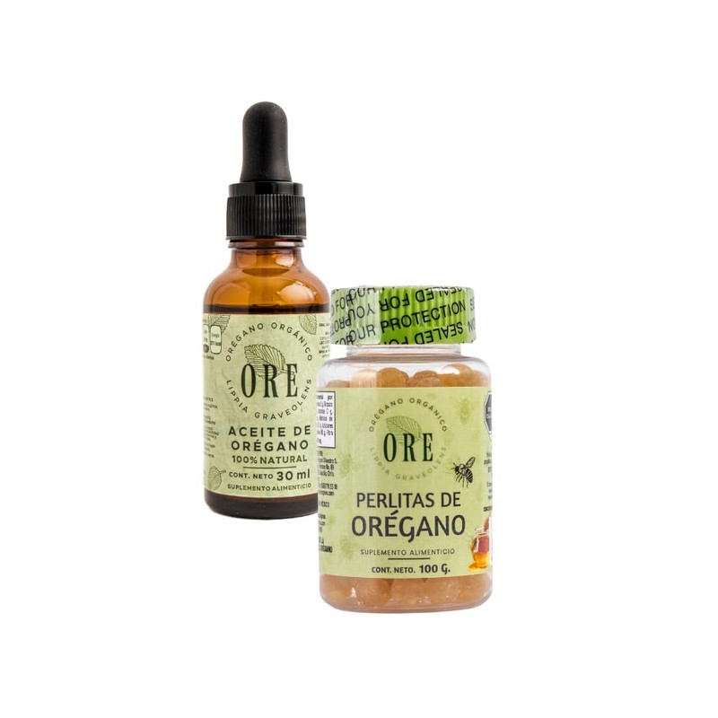 ORE Perlitas de Miel con Aceite de Orégano - Frasco | Natural y Delicioso Descubre las Perlitas de Miel con Aceite de Orégano ORE en su práctica presentación en frasco. Estas deliciosas perlitas combinan ingredientes naturales como miel de abeja, propóleo, eucalipto y sauco, diseñadas para ser prácticas y fáciles de consumir en cualquier momento. Características y Beneficios: Ingredientes naturales: Miel de abeja, aceite de orégano y extractos de plantas tradicionales. Práctico frasco: Fácil de llevar contigo donde lo necesites. Sabor suave y agradable: Perfecto para adultos y niños. Fácil de consumir: Ideal para complementar tu día en cualquier lugar. Modo de Uso: Adultos: Degustar 2 perlitas hasta 5 veces al día. Niños: Degustar 1 perlita hasta 5 veces al día. Aceite de Orégano ORE - 30 ml con Gotero | Orgánico y Versátil El Aceite de Orégano ORE es un producto de alta calidad, elaborado con aceite orgánico de cosecha salvaje combinado con aceite de oliva prensado en frío. Perfecto para múltiples usos, esta presentación con gotero facilita la dosificación precisa. Características y Beneficios: Aceite de Orégano Orgánico: Extraído mediante arrastre de vapor, garantizando su pureza y calidad. Aceite vehicular de oliva extravirgen: Rico en Omega 9 (ácido oleico). Práctica presentación en gotero: Ideal para usos internos y externos. Rendimiento excepcional: Contiene aproximadamente 480 gotas por frasco. Modo de Uso: Uso interno: Tomar hasta 5 gotas diluidas en agua, tres veces al día. Para niños: Diluir hasta 3 gotas en agua o té, tres veces al día. Uso externo: Aplicar 5 a 10 gotas en pecho, espalda o plantas de los pies. Calidad garantizada: Ingredientes naturales cuidadosamente seleccionados. Práctico y versátil: Soluciones para diferentes necesidades en un solo producto. Fácil de usar y llevar: Diseñado para adaptarse a tu rutina diaria.