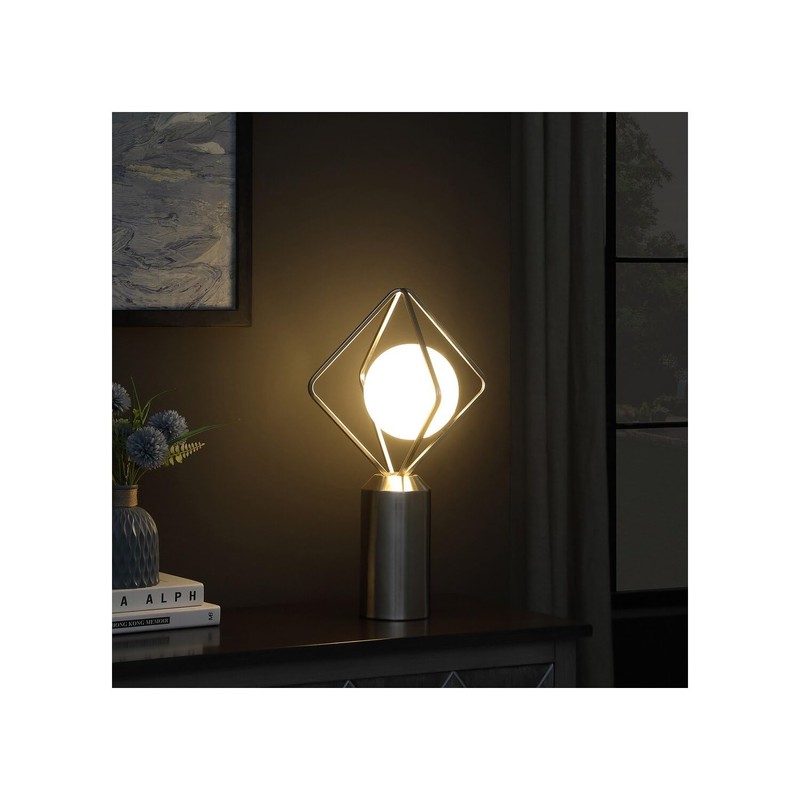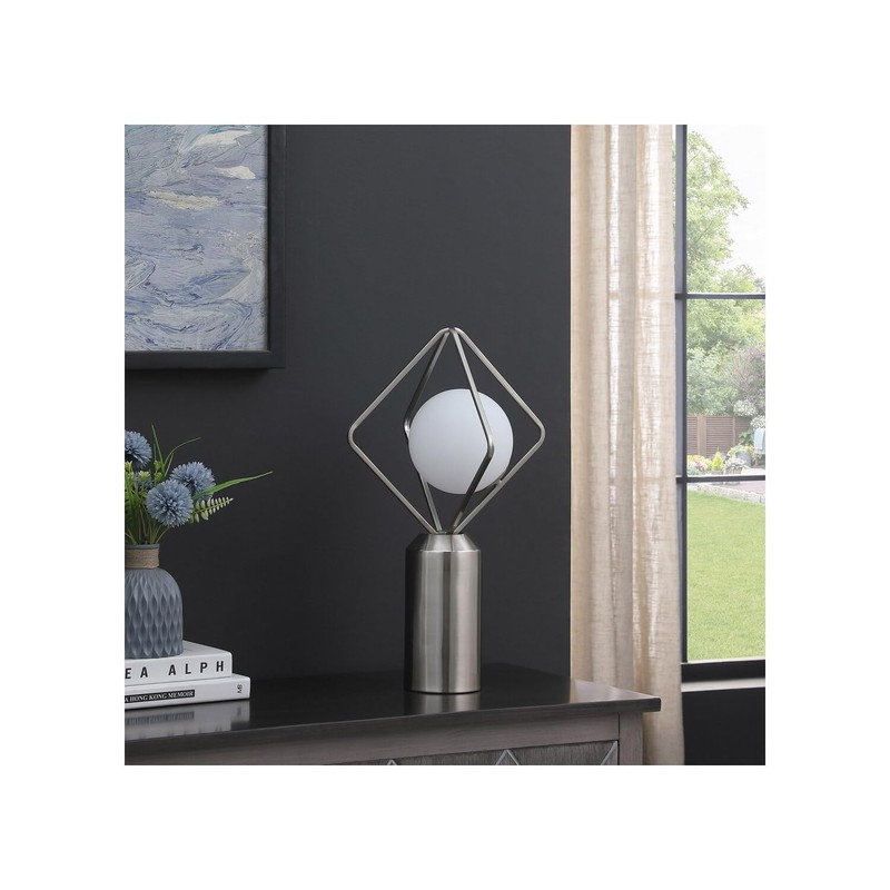 Add a scientific and astronomical touch to your home with the inclusion of this beautiful Pendeloque table lamp. It features a metal cylindrical body pedestal in an orb glass shade surround by an octahedron metal cage. Touched with sophisticated grace, the soft glow of the glass orb Table Lamp delivers a flood of ambient light in any space. While the refined tones of the smooth cylindrical metal and the round glass shade enhance the robust silhouette of the monoclinic with modern elegance. This metal cylindrical table lamp features a beautiful brushed silvertone finish that adds a rich, silver accent to your living space. The lamp is elegantly simplicity with smooth edges. This lamp provides a subtle and appealing contemporary design wherever placed. Features. InLine On/Off Switch located on the Silver Cord. The distance from the base to the inline On/Off Switch measures 8.5LCare Instruction. Wipe with a damp cloth for cleaningSpecifications. Material White Glass Orb Shade, Brushed Silver Metal Table Body. Finish Glass and Brushed Silver Metal Table Base. Bulbs 40 Watt G9 3.2W LED. Glass Orb Shade Measures 6.25 x 6.25 x 6.25 in.. Octahedron Brushed Silver Metal Cage Measures 12 x 12 x 12 in.. Brushed Silver Cylindrical Table Body Measures 4.5 x 4.5 x 8.5 in.. Input Voltage 110120V. Silver Cord Measures 61 in.. Weight 9 lbs