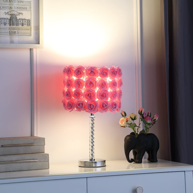 - Materials: Cotton/Linen w/ Vinyl Roses, Acrylic Twisted Body + Metal. Finish: 14 Row of Pink Roses in Bloom, Clear Acrylic Twisted Body + Silver Chrome Base