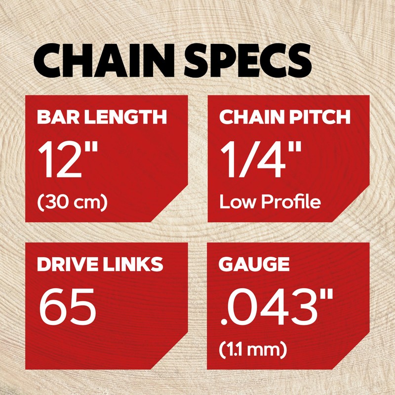 - π©ππ₯πππ¬ πππ§: This premium Oregon chainsaw chain is suitable for saw chain models that run a 12 inch bar, 1/4 inch low-profile pitch, .043 Inch (1.1 mm) gauge, 65 drive links