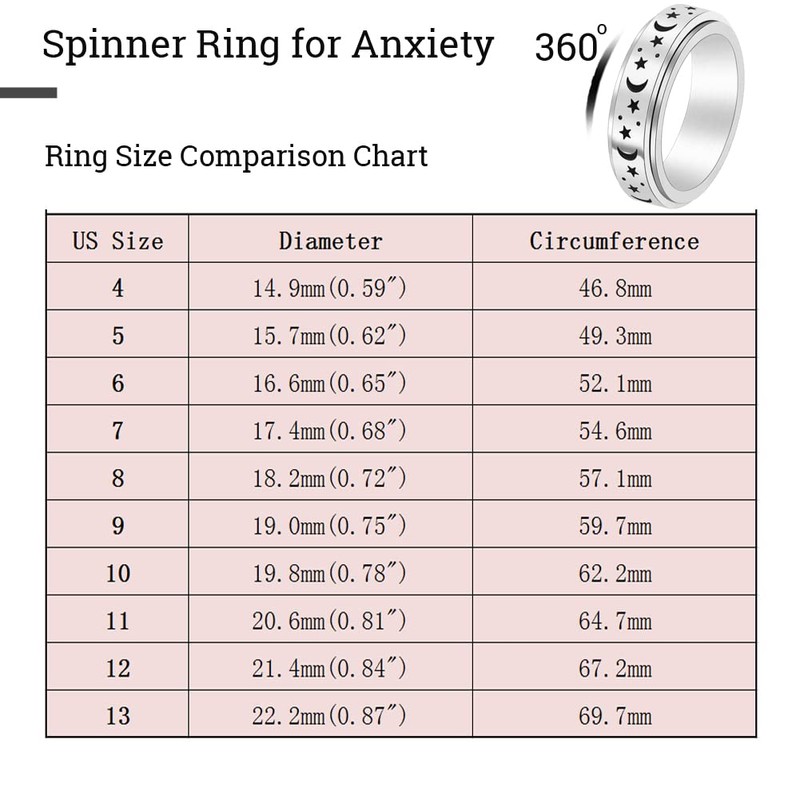 - The size of spinner ring: our rings are crafted with care and US standard size, size 6 to size 10 availabel,we suggest you check your finger size carefully or measure the size in your local jewelry store before ordering .