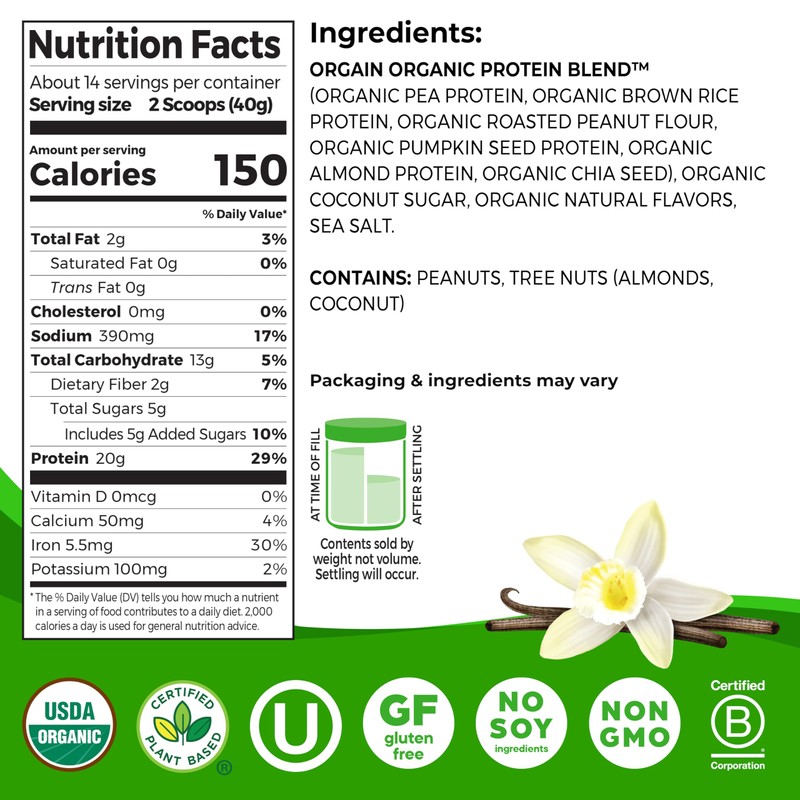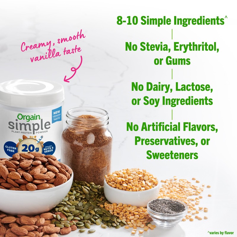 Orgain’s Simple Protein powder is good, clean nutrition in its truest form. Crafted with only 8-10 clean, simple ingredients^, this is protein powder - elevated. Delicious, food-based ingredients, such as organic nuts and seeds, combine to create the perfect harmony of flavor and nutrition all while packing in 20g of vegan protein in every serving. Our Simple Protein powder is crafted from high-quality, organic ingredients with names you can recognize and pronounce: organic almonds, organic peanuts, organic chia seeds, organic pumpkin seeds, organic golden pea, and organic coconut sugar. It’s that simple. No stevia, erythritol, thickeners and gums. No gluten, soy, dairy, GMOs or artificial colors, flavors and preservatives either. No tricks or gimmicks. Certified Organic, this protein powder simply doesn't get any better. Sometimes simple is just plain better. Plus, when it comes to flavor and versatility, this powder delivers. This smooth and creamy powder can be enjoyed as a protein shake mixed with your liquid of choice (we love almond milk), as a delicious addition to a morning smoothie, or even baked into your next batch of cookies for an added nutritious twist in every bite. Go ahead, fuel up with the powder that's a treat for both your taste buds and your body so you can have energy to keep on going! *per serving ^varies by flavor ^^Source: IRI, Total US MULO, Latest 52 weeks ending 10.30.22