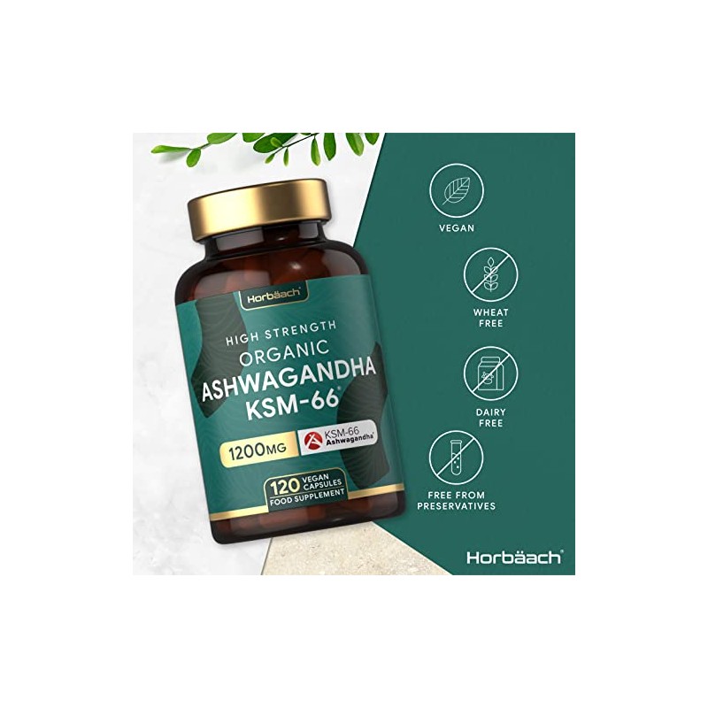 Organic Ashwagandha KSM 66 1200mg | 120 Count | Vegan Powder Capsule Supplement | by Horbaach