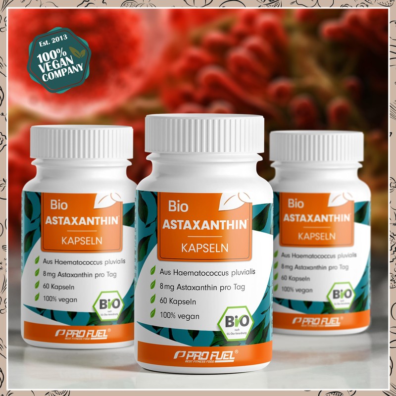 Our organic astaxanthin capsules contain a high-quality extract from the Haematococcus pluvialis algae in first-class organic quality and are optimally high dose with 8 mg astaxanthin per capsule. Astaxanthin is a natural dye formed by blood rain algae to significantly improve their chances of survival in adverse living conditions.