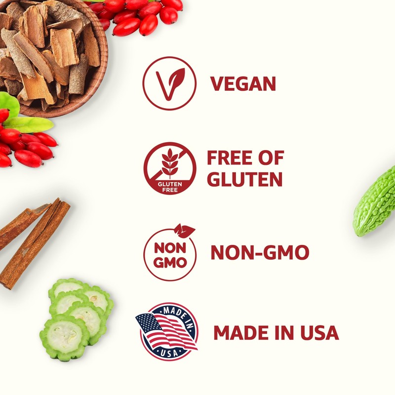 - 11-in-1 Herbal Blend: Includes Ceylon Cinnamon, Bitter Melon, Banana Leaf, Gymnasium Leaf, Schisandra, Neem, Amla Fruit, Brown Seaweed, and Black Pepper Extract for comprehensive wellness benefits and enhanced absorption.