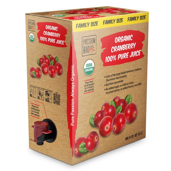 • PERFECT FOR REGULAR CONSUMPTION: Enjoy PassionBio's Pure Cranberry Juice in our innovative bag-in-box packaging, staying fresh for 3 months unrefrigerated