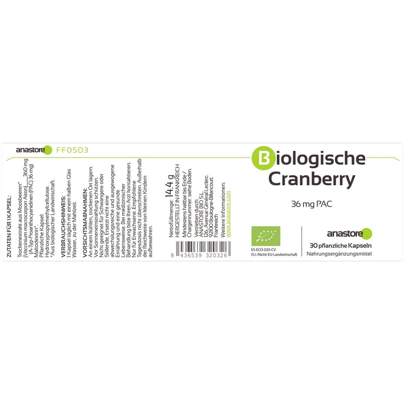 Organic Cranberry * Titrated 10% in Proanthocyanidins * 360 mg / 30 Vegetable Capsules * Prevention of Urinary Tract Infections * Controlled Quality by Certificate of Analysis * 100% Satisfied or