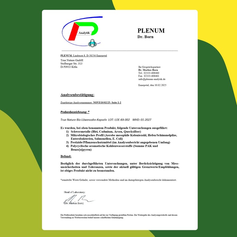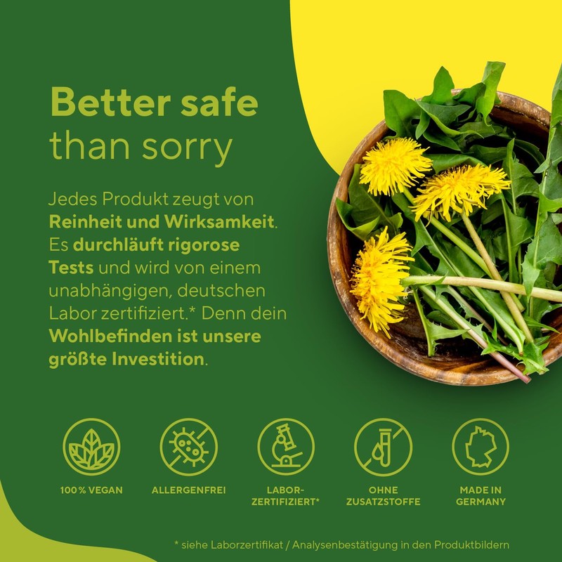 - True ingredients - Our organic dandelion root extract comes from ecological cultivation and is obtained under strict conditions. Despite the purest processing, certified (see laboratory certificate/analysis confirmation in the product images), an independent German laboratory purity and active ingredient content of each batch. The raw material is bottled in Germany according to ISO and HACCP standards.