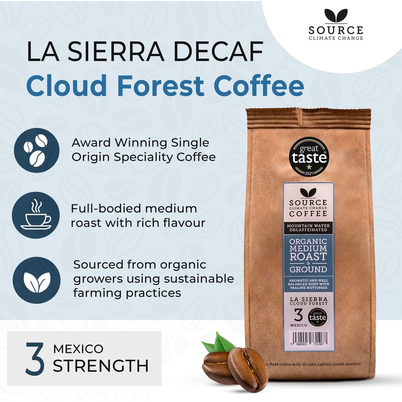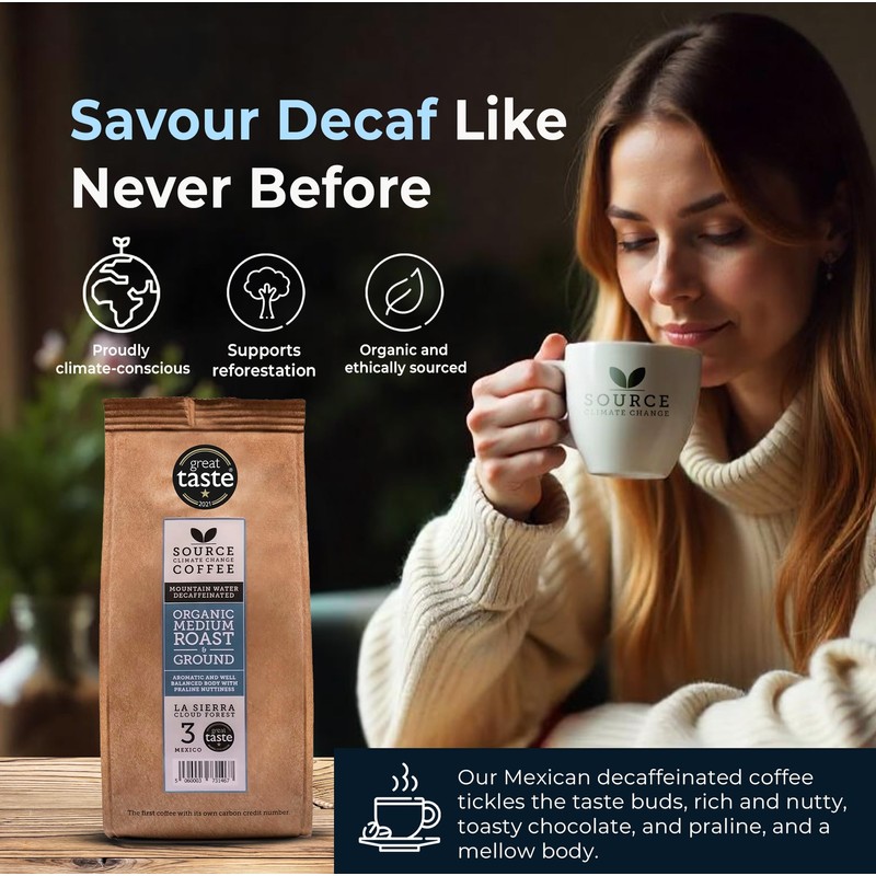 Organic Decaffeinated Mexico Ground Coffee - Award Winning Medium Roast by Source Climate Change Coffee – Single Origin 100% Arabica – Smooth Praline Nuttiness, Freshly Roasted 227g bag