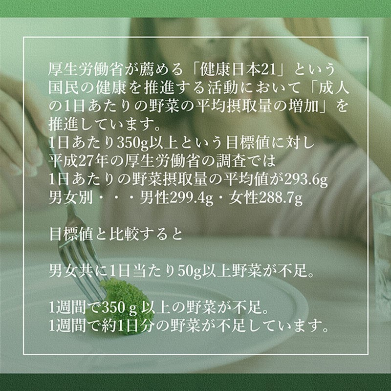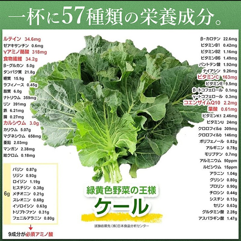 This is an organic JAS certified green juice that uses Far Infrared, which does not damage the nutrients, flavors, colors, and aroma of the scale. Since 2017, we use 100% kale that is grown in organic without pesticides or chemical fertilizers. Kale is a very vital vegetable that is harvested year round with a large number of dietary fibers and enzymes. It can be dissolved in water for easy eating, and can be used for a variety of dishes, including salad dressings, soups, Japanese sweets, noodles, etc.