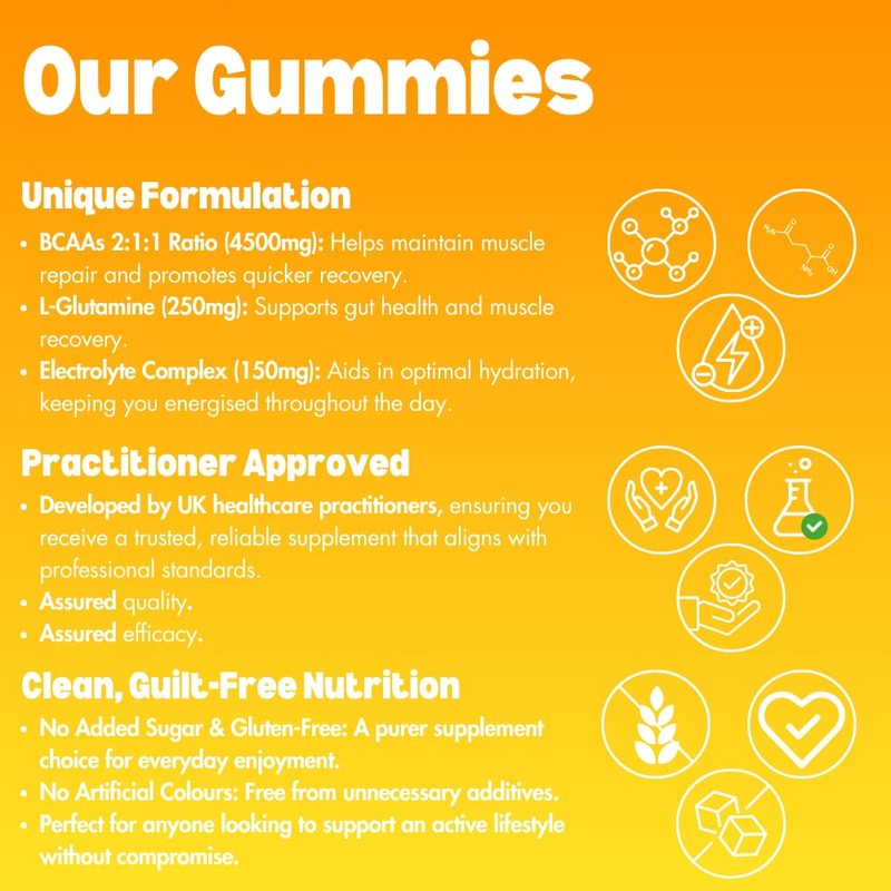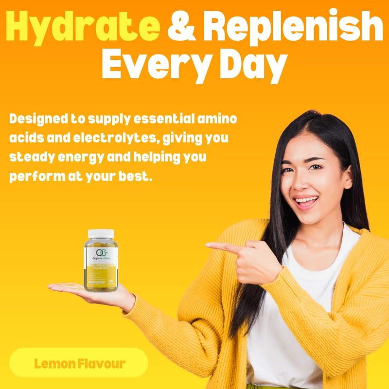 Product descriptionUses of Amino Hydrate Gummies Post-Workout Recovery Promote muscle repair and reduce soreness with 4500 mg BCAAs and 250 mg L-Glutamine. Replenish electrolytes to restore hydration and balance after intense training. Intra-Workout Hydration Stay energized and hydrated during workouts with the refreshing lemon-flavored electrolyte support. Reduce muscle fatigue and sustain performance with amino acid support. Daily Hydration Support Maintain electrolyte balance and hydration throughout the day, even on rest days. Boost Immune and Gut Health Support immune function and gut integrity with L-Glutamine, especially during periods of stress or recovery. On-the-Go Energy and Nutrition A convenient and delicious alternative to powders or shakes for quick recovery and hydration anywhere, anytime. Muscle Preservation Ideal for individuals on low-calorie or intermittent fasting diets to prevent muscle breakdown. Enhanced Endurance Improve endurance and performance during prolonged physical activities like running, cycling, or hiking. This product is perfect for fitness enthusiasts, athletes, or anyone looking to stay hydrated, energized, and healthy throughout their day.IngredientsBCAAsL-GlutamineElectrolytes Complex