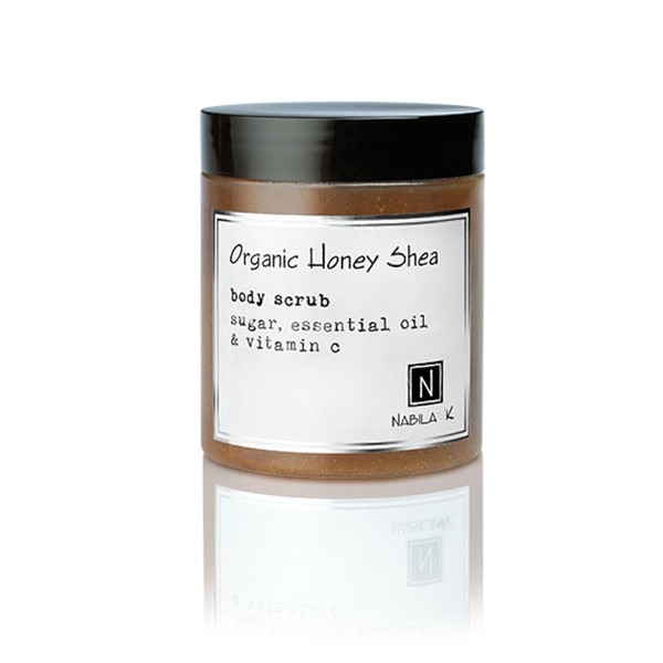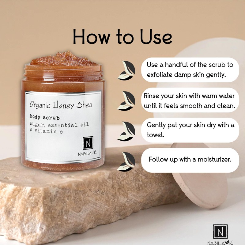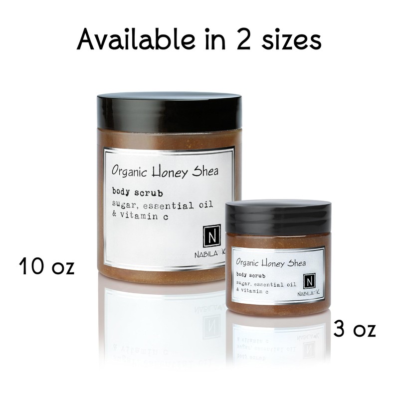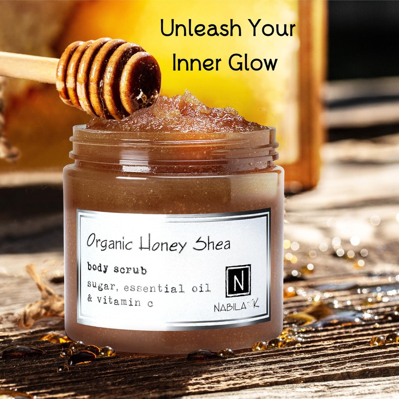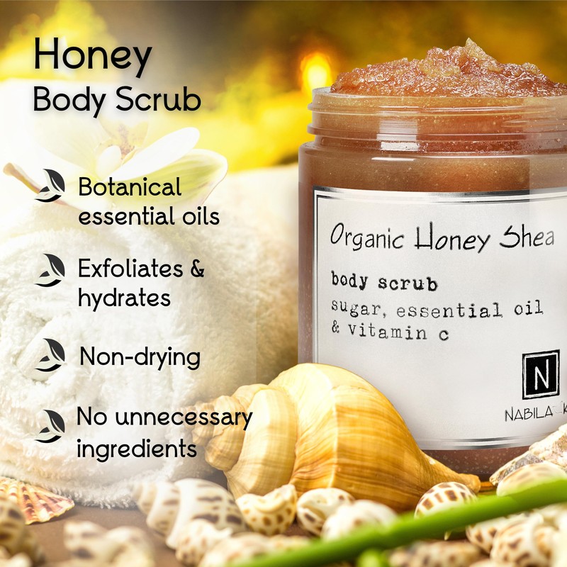 Organic Honey Shea Body Scrub Made in USA with Essential Oil and Vitamin C by Nabila K - Exfoliate and Moisturize for Smooth Skin - Luxury for Women & Men, 10 oz