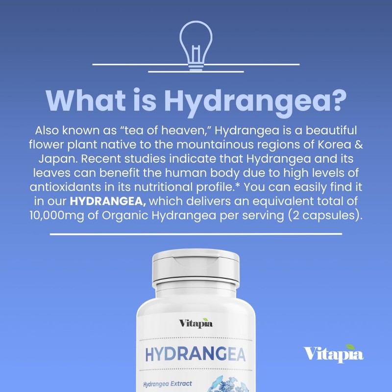 - ABOUT OUR ORGANIC HYDRANGEA CAPSULES — With a massive equivalent total of 10,000mg of Hydrangea Leaf per serving, our Organic Hydrangea Capsule Supplement is made with a potent and antioxidant-rich Hydrangea Leaf 10:1 Extract that comes in easily consumable veggie capsules that are convenient to implement into our everyday health routines! These capsules are specially formulated and made to support one's daily antioxidant intake, kidney health, urinary tract, skin texture, and immune system.*