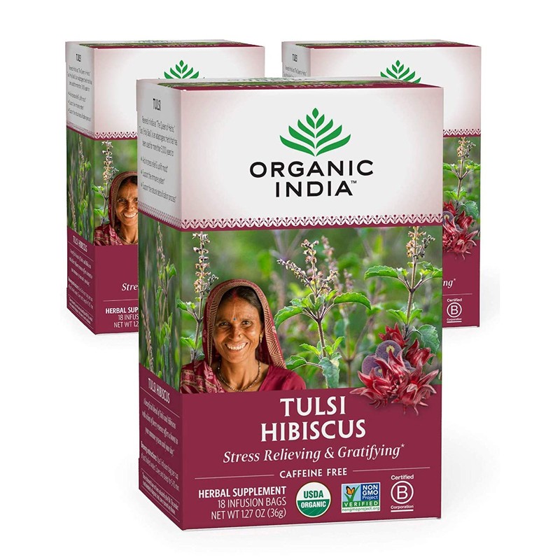 Organic India Tulsi Hibiscus Herbal Tea - Stress Relieving & Gratifying, Immune Support, Adaptogen, Vegan, USDA Certified Organic, Non-GMO, Calming, Caffeine-Free - 18 Infusion Bags, 3 Pack