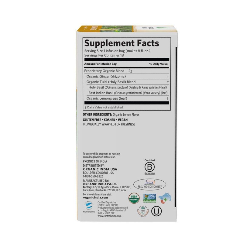 Organic India Tulsi Lemon Ginger Herbal Tea - Stress Relieving & Reviving, Immune Support, Aids Digestion, Vegan, USDA Certified Organic, Non-GMO, Caffeine-Free - 18 Infusion Bags, 3 Pack