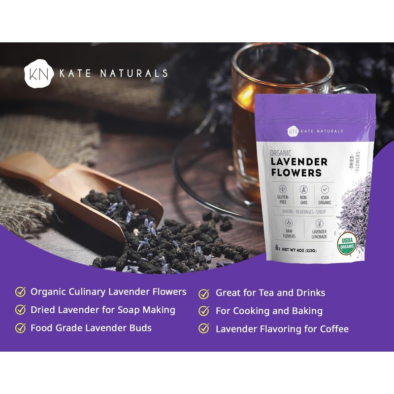 Kate Naturals Dried Lavender Flowers for Tea, Syrup, Lemonade, Soap Making. Edible Culinary Grade Buds (4oz, Organic, Food Grade)