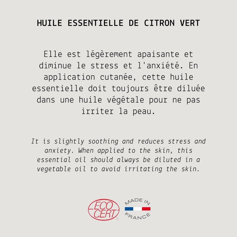 - Lime essential oil, with its soothing and firming properties, is traditionally used to enhance the "orange peel" effect and helps skin tightening. Its soothing properties make it an ally against stress, morality sinking and allows to effectively fight against nervous tension. Our lime essential oil, labeled AB, allows the dishes to subtly flavour. (1-2 drops)